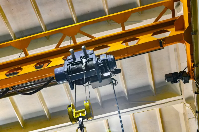 The lifting component itself is called the hoist, and it is attached to a trolley that runs on rails along the top of the bridge beam. This beam is connected to horizontal girders, which are then attached at each end to trucks. These trucks are connected at right angles to the horizontal girders and travel along the bridge or parallel runways.
